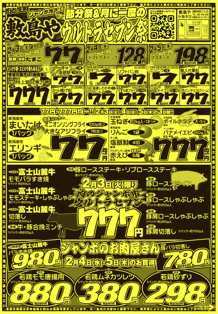 肉🥩と生鮮ジャンボ市 敷島や水島店では【朝市!夕市!ジャンボ市‼】と題して 様々なイベントを開催中‼