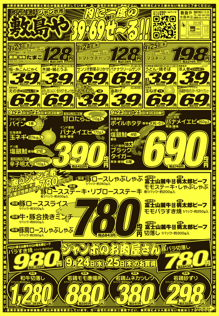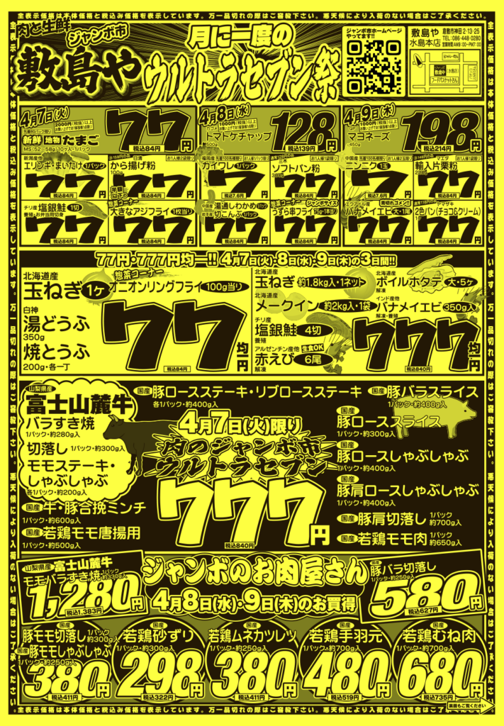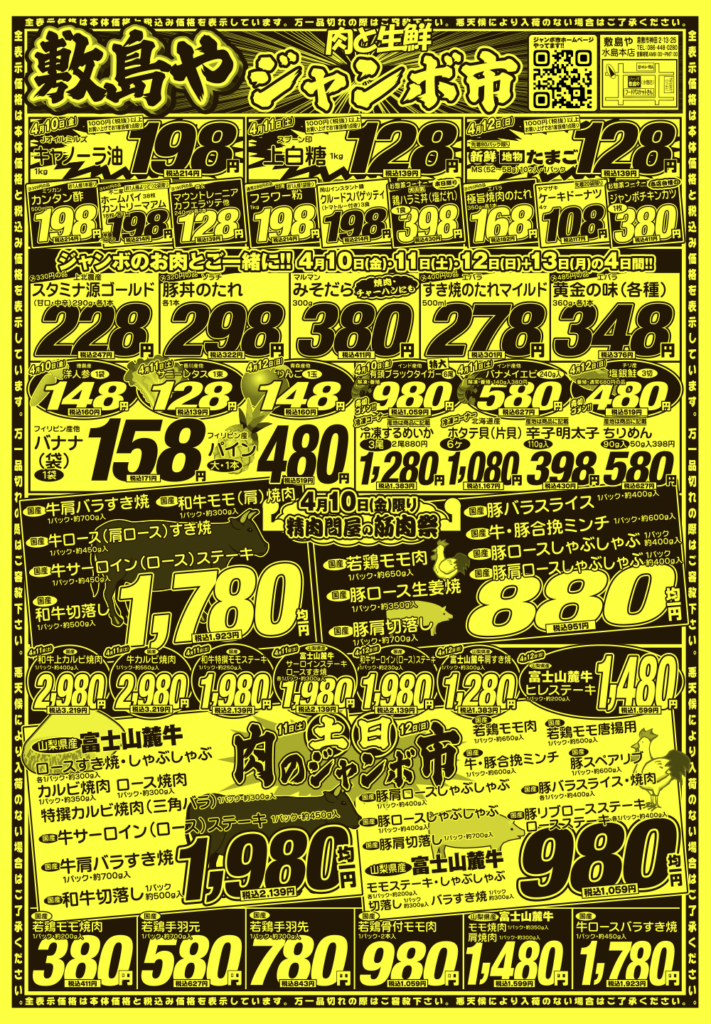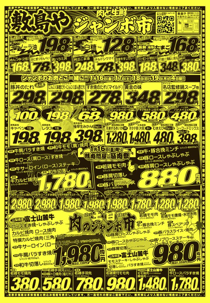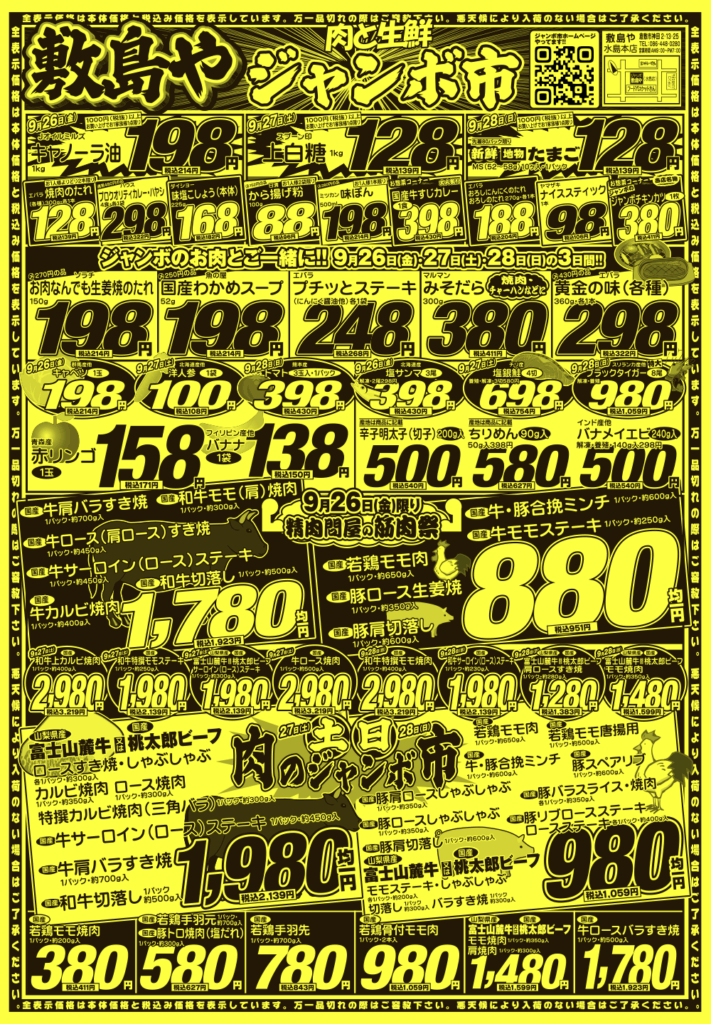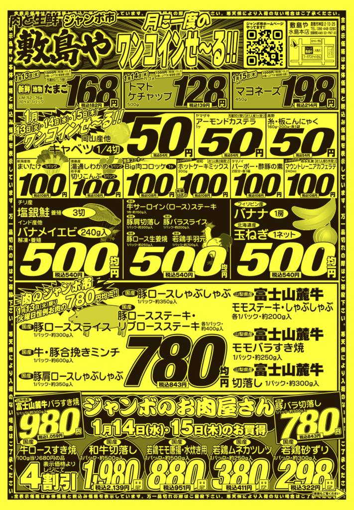 肉🥩と生鮮ジャンボ市 敷島や水島店では【朝市!夕市!ジャンボ市‼】と題して 様々なイベントを開催中‼