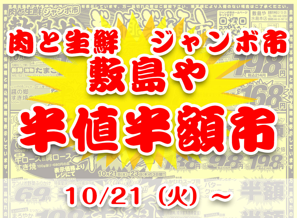 肉🥩と生鮮ジャンボ市 敷島や水島店では【朝市!夕市!ジャンボ市‼】と題して 様々なイベントを開催中‼ 月曜日には17時から【夕市】開催!野菜や果物を全品売り尽くし特価!! 火曜日にはオープンから【朝市】開催!各部門売り場にて激安大特価で販売。商品が無くなり次第終了なので、お早目のご来店を…
